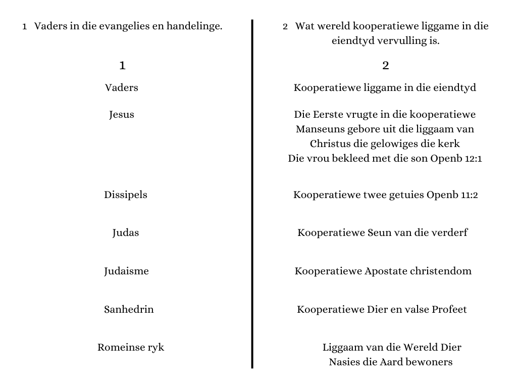 Die ou testament is (die letter) wat bestaan uit n enkel stamvader, wat in ons tyd in die boek Openbaring en in die nuwe Testament n kooperatiewe liggaam is. B.V. Christus was die enkel saad in die ou Testament, in die nuwe Testament is ons n kooperatiewe liggaam sy gemeente. Wat Christene genoem word. Baie belangrik daar is niks in die nuwe Testament en in Openbaring wat nie n kooperatiewe liggaam is nie.
